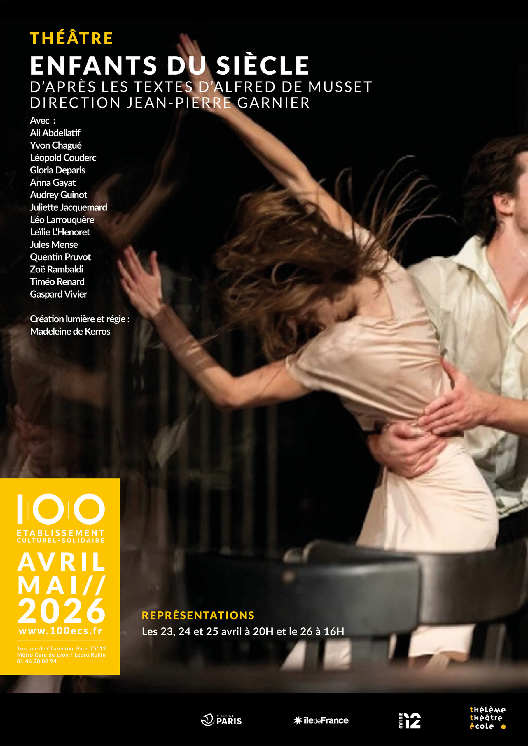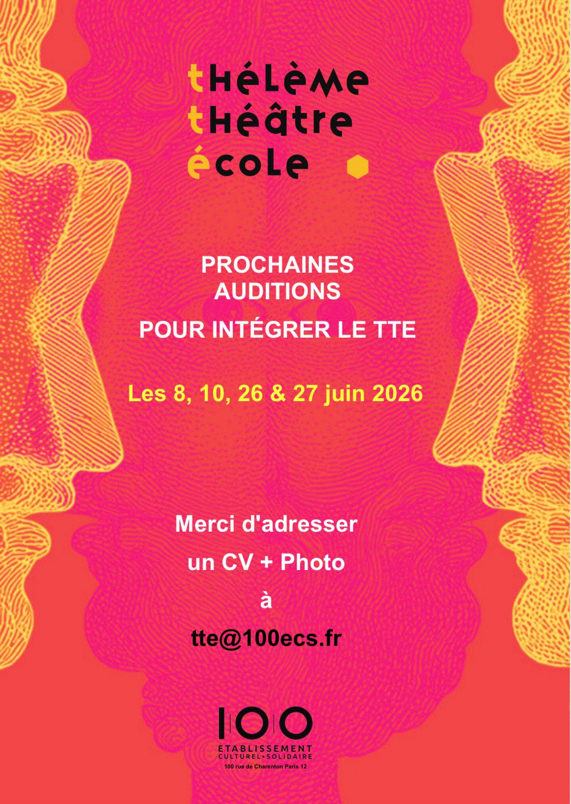 - Un enseignement d’Art dramatique professionnalisant depuis 2022, avec la création du Thélème Théâtre École, à l’initiative de Frédéric de Beauvoir (directeur du 100ECS), Isabel Segovia (directrice adjointe du 100ECS) et Julie Brochen (comédienne et metteuse en scène, ancienne directrice du Théâtre National de Strasbourg), à qui a été confiée la direction pédagogique du Théâtre École.