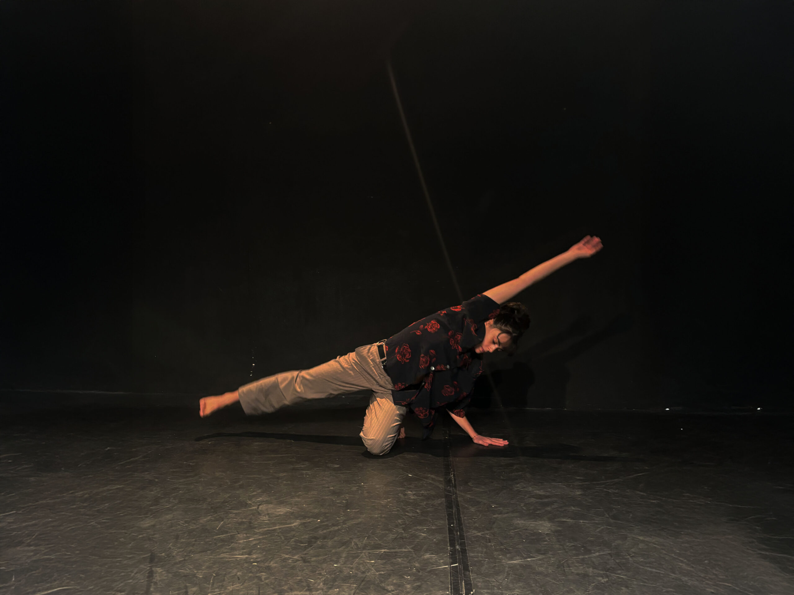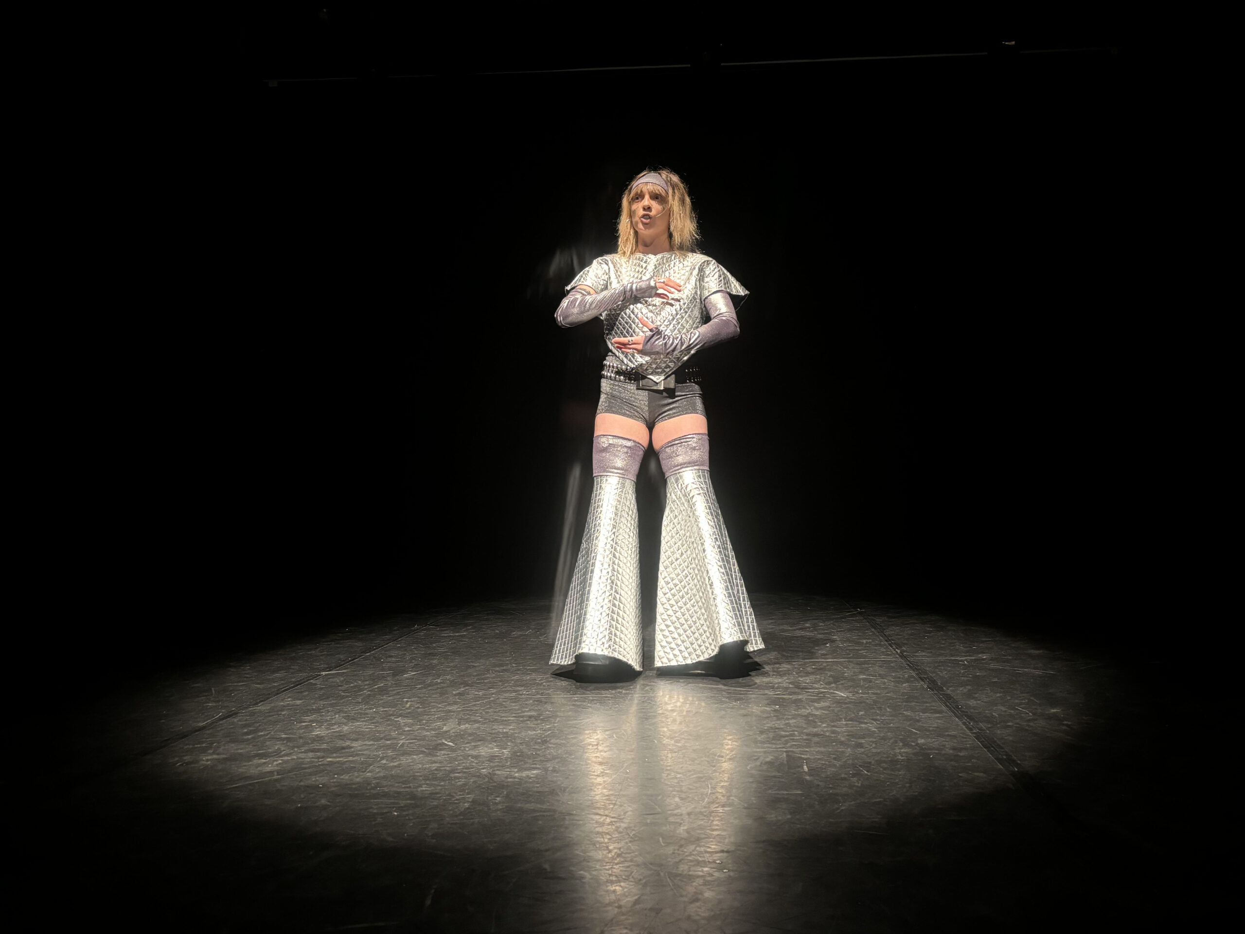 Le plateau fait 6m de large sur 8m de profondeur. C’est une « boîte noire » avec un tapis de danse au sol.